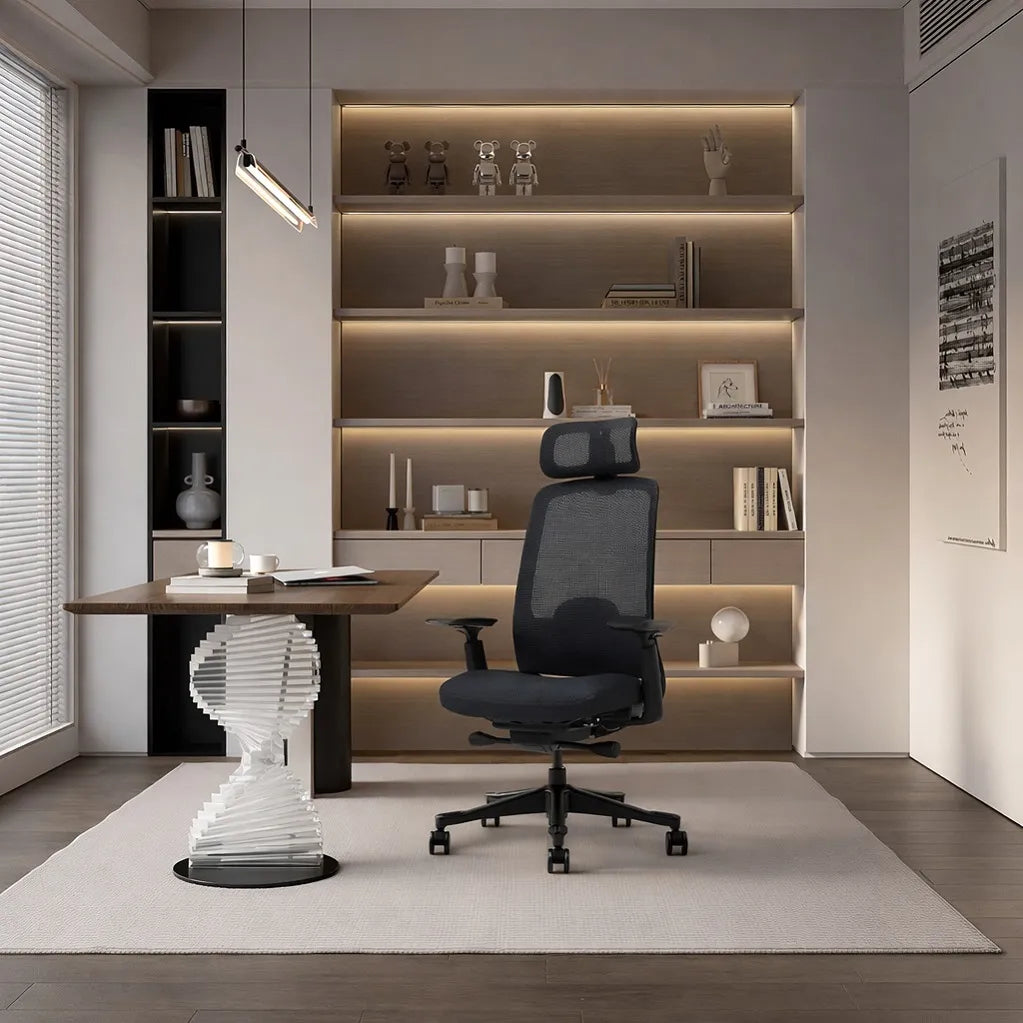 Ergonomic chair designed without a headrest, maintaining a cleaner profile while retaining full back support.